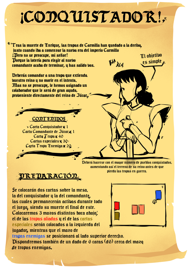 ¡Conquistador! es un juego de estrategia y gestión de recursos de un sólo jugador en el que deberás hacer crecer tu imperio como el comandante de las tropas de Carmilla. Para esto estarás acompañado de la comandante del reino de Júcar, mucha suerte, conquistador.